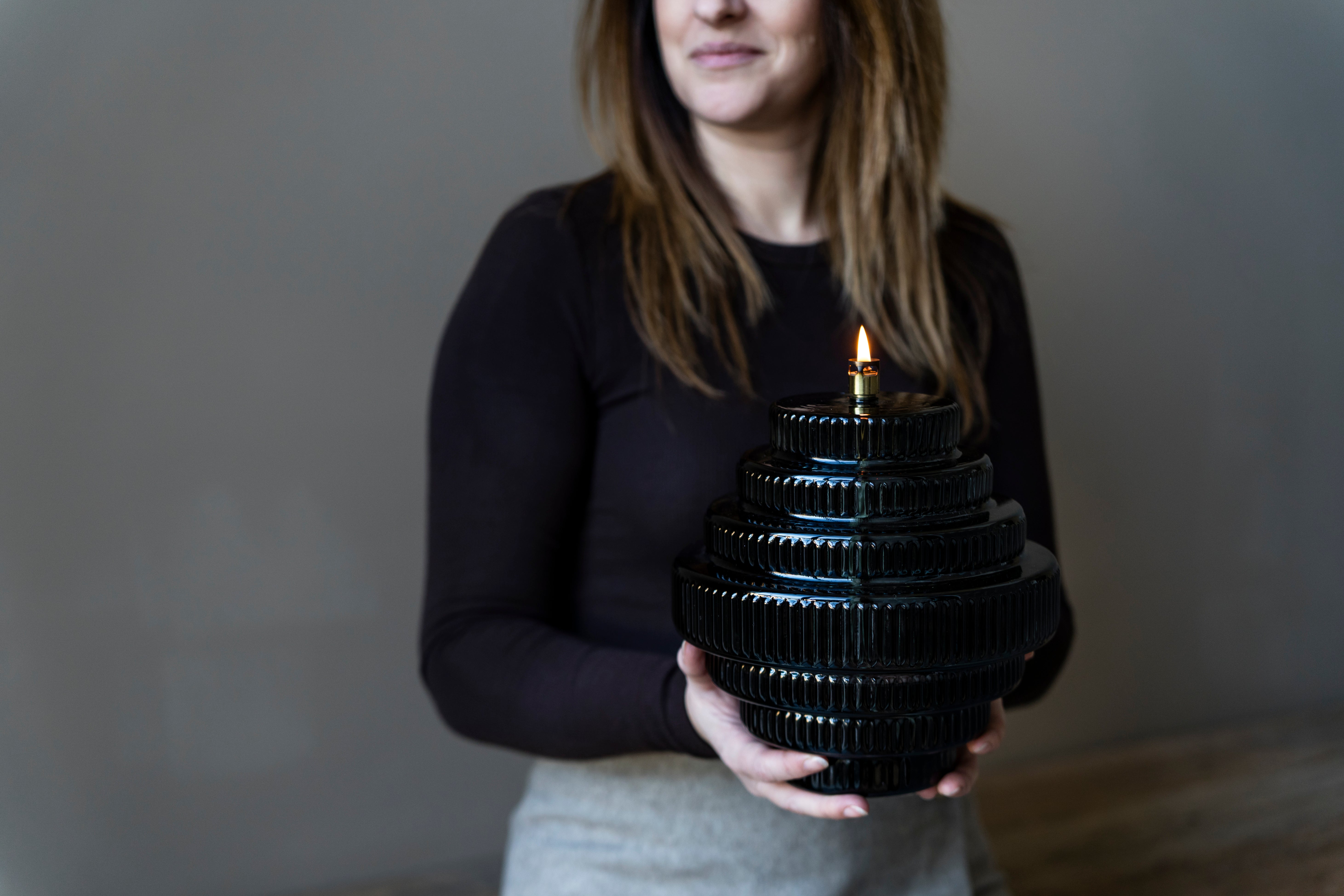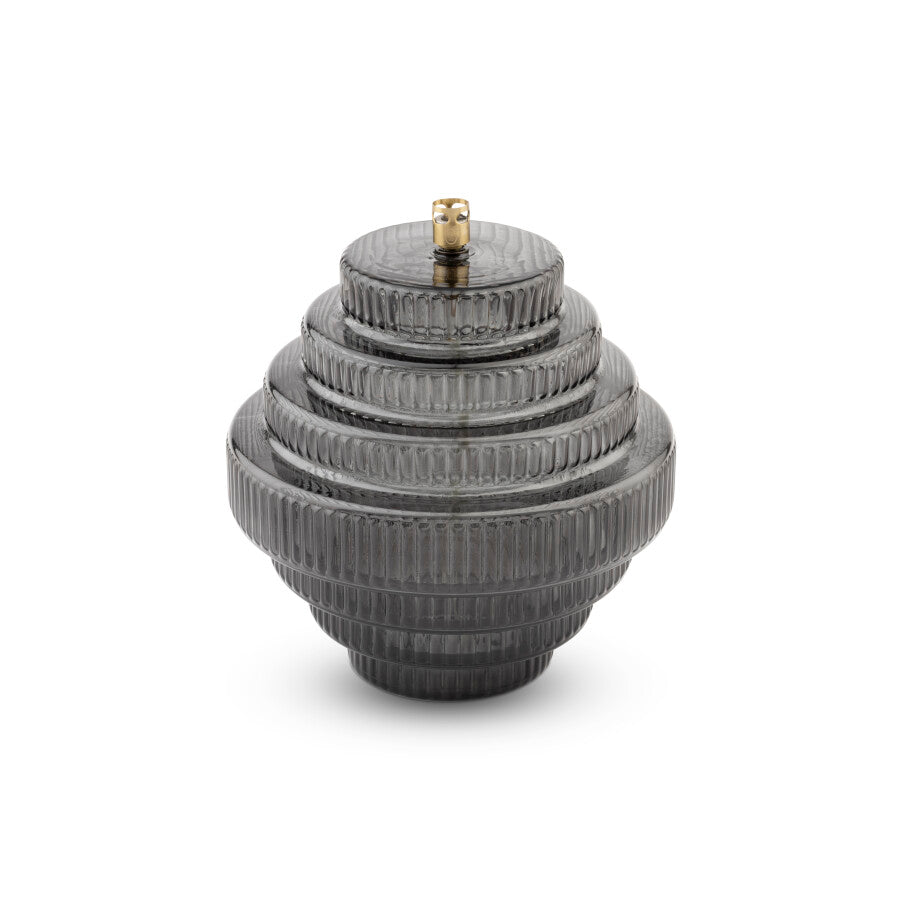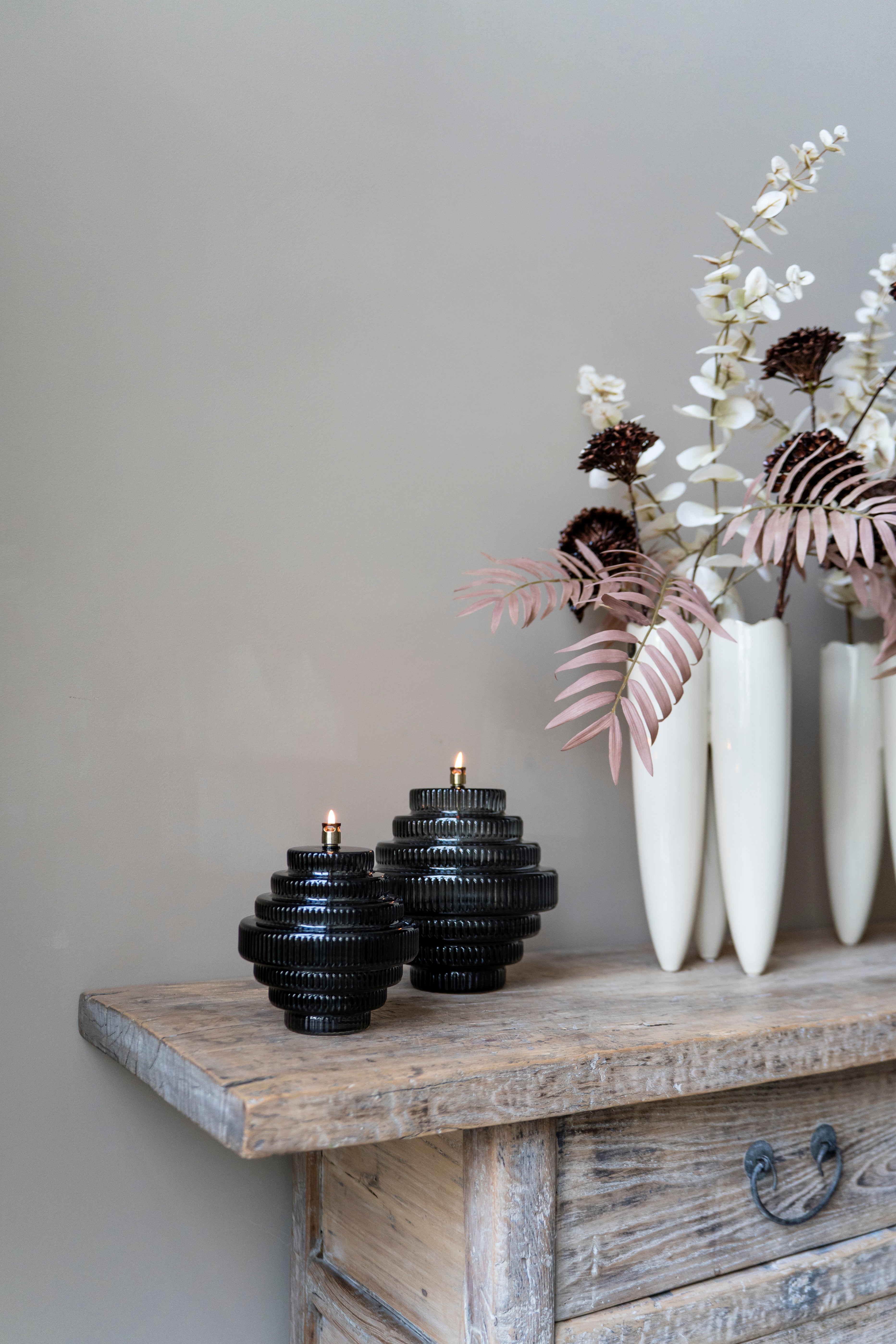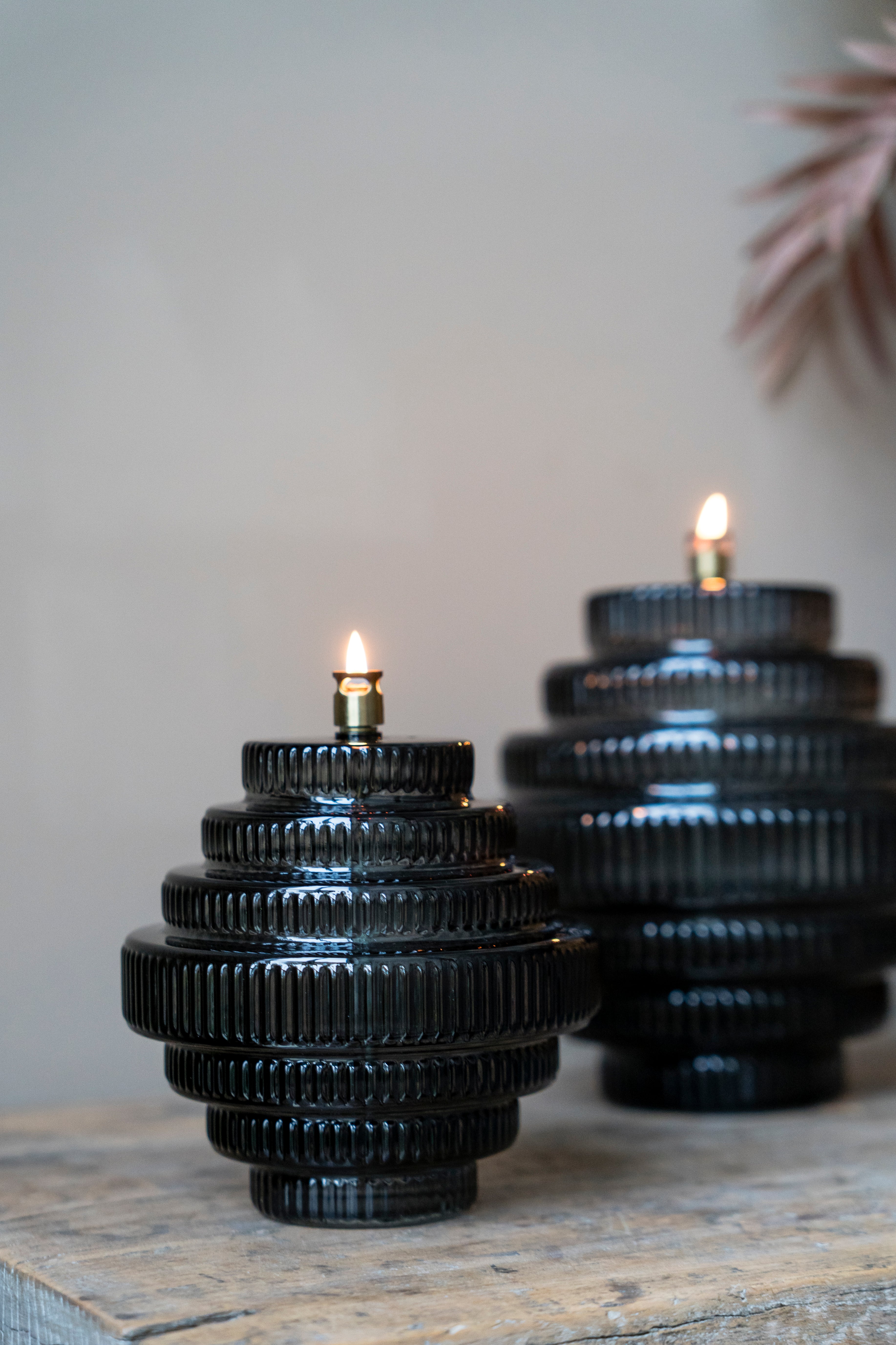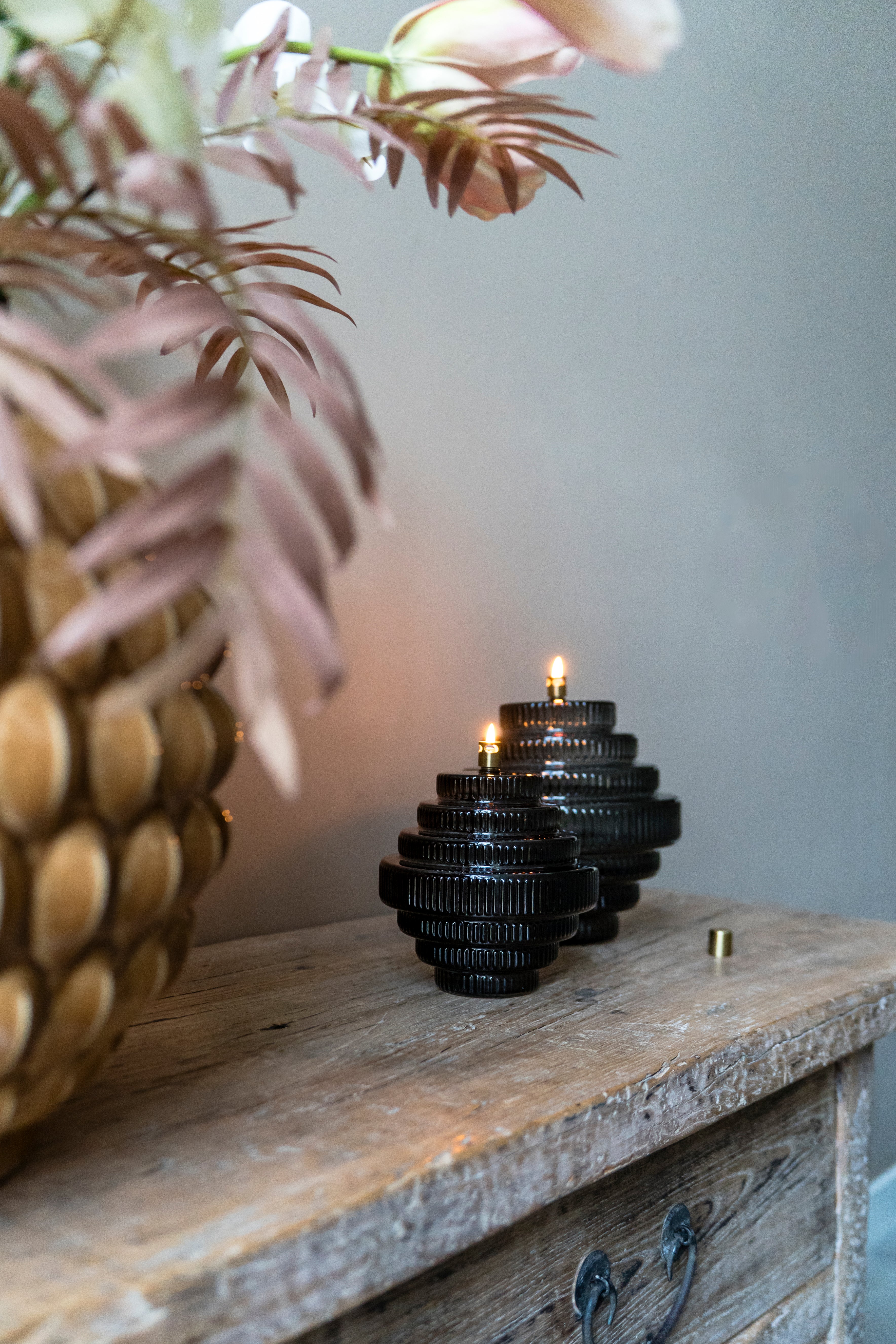 De olielamp Twin Smoked Brass  is een royaal vormgegeven olielamp met een gelaagde, sculpturale opbouw die direct opvalt. Het trapsgewijze ontwerp in smoked glas geeft het licht extra diepte en zorgt voor een warme, rustige gloed wanneer de lamp brandt. De messing afwerking aan de bovenzijde voegt een verfijnd, tijdloos accent toe.