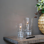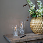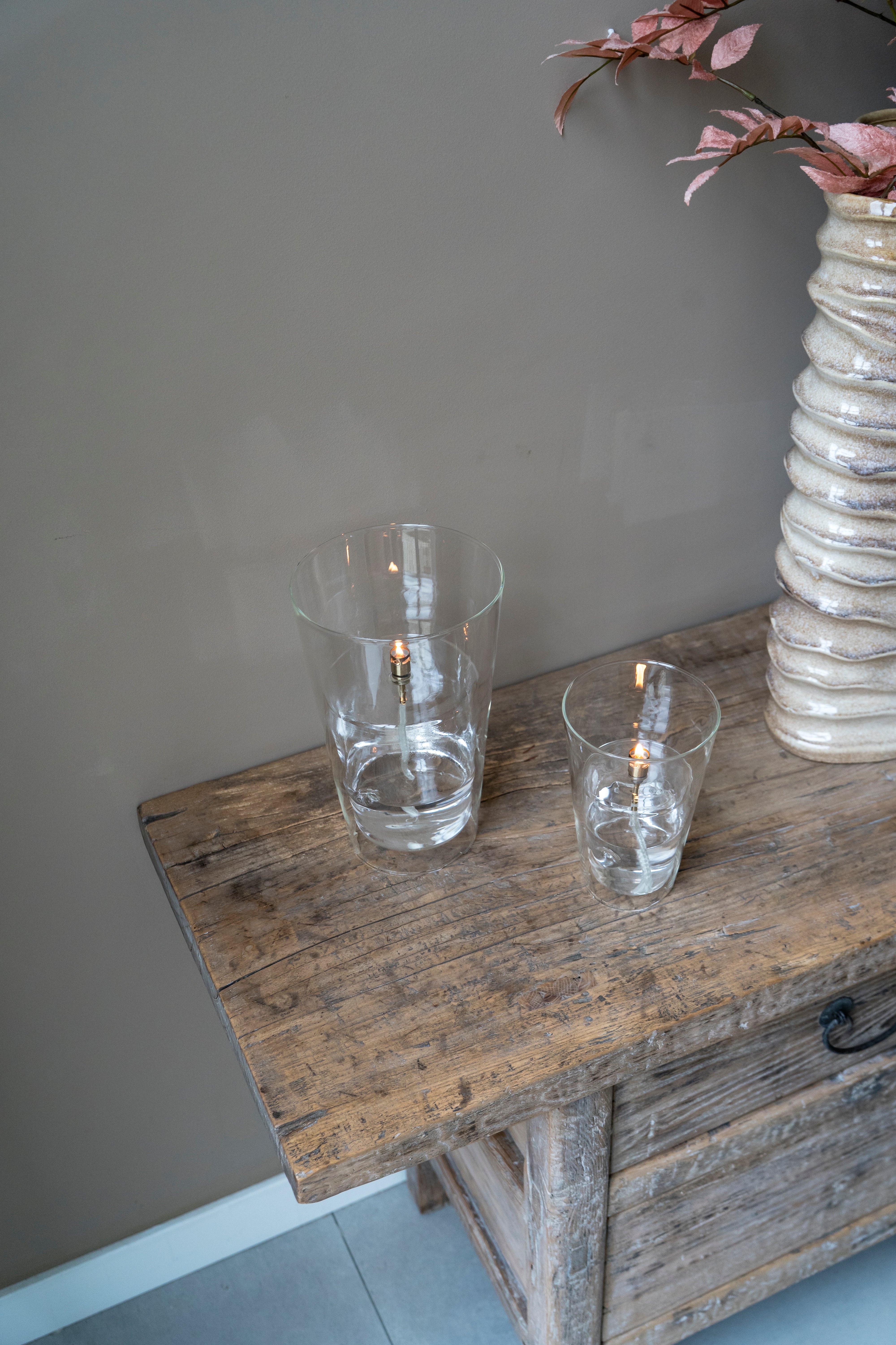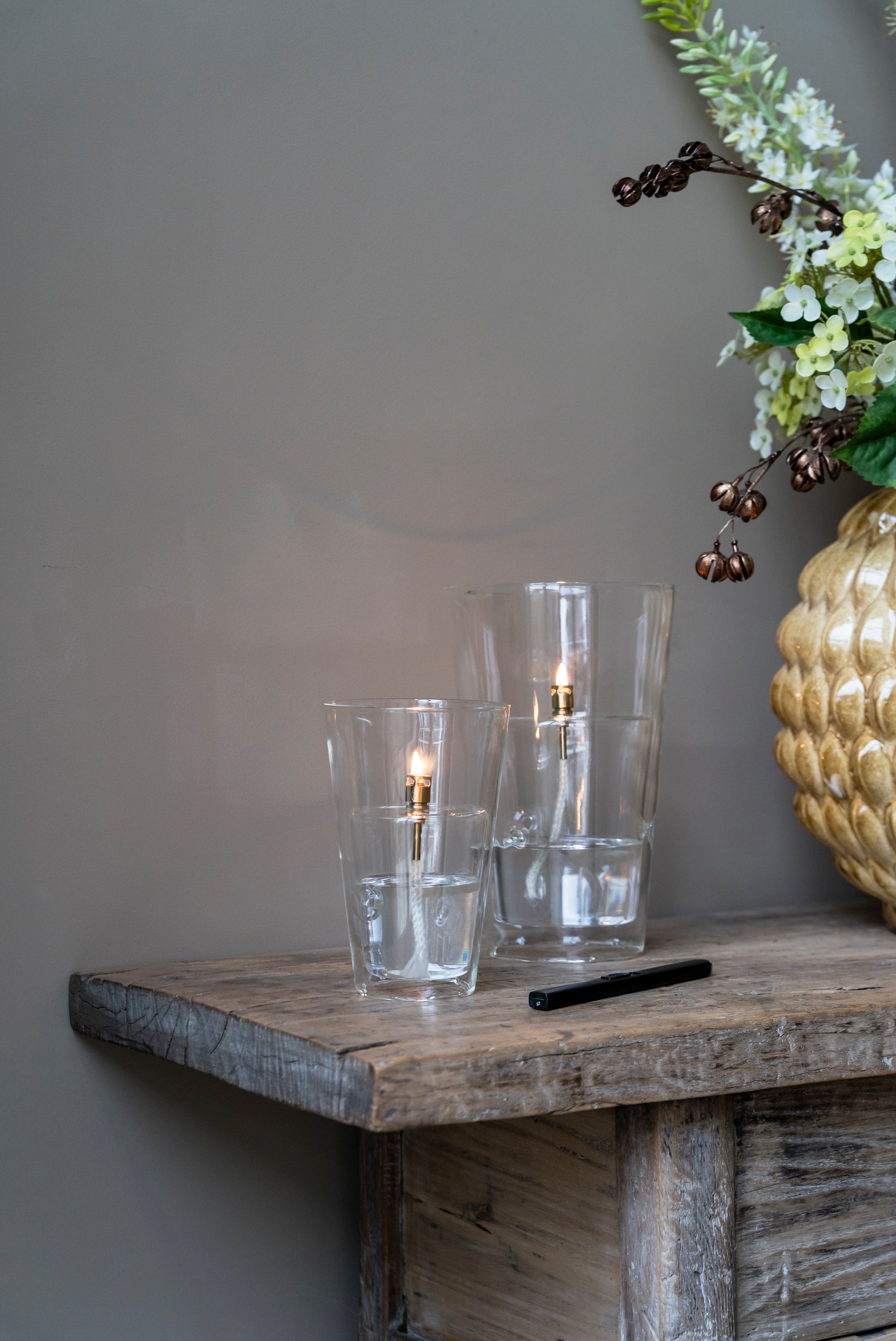 Die Windshelters Conical Clear Brass sind elegante Windlichter, die Funktionalität und raffiniertes Design vereinen. Die konische Form des klaren Glases schützt die Flamme vor Zugluft, während die integrierte Öllampe mit Messingdetails für eine warme, stabile Lichtquelle sorgt.