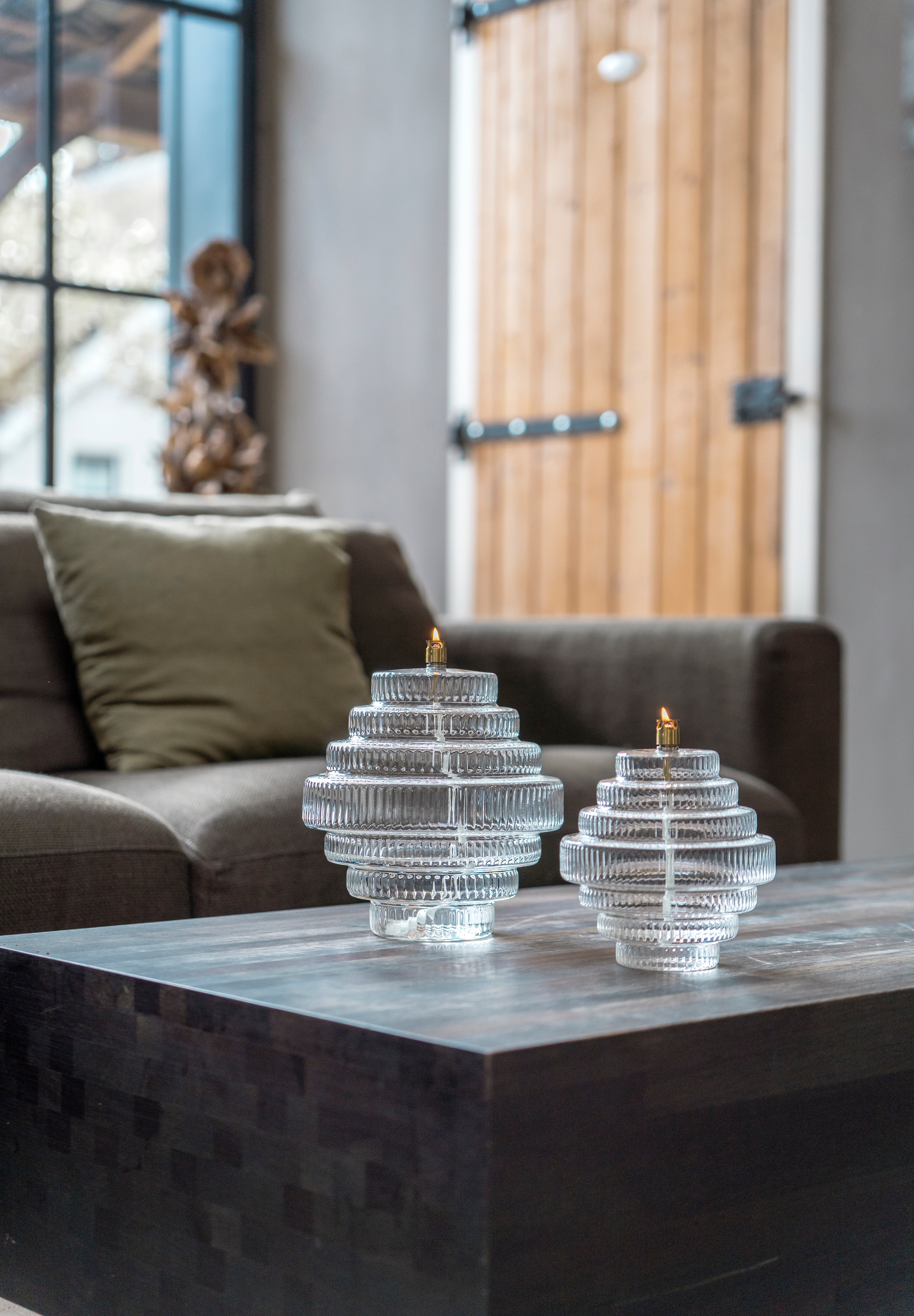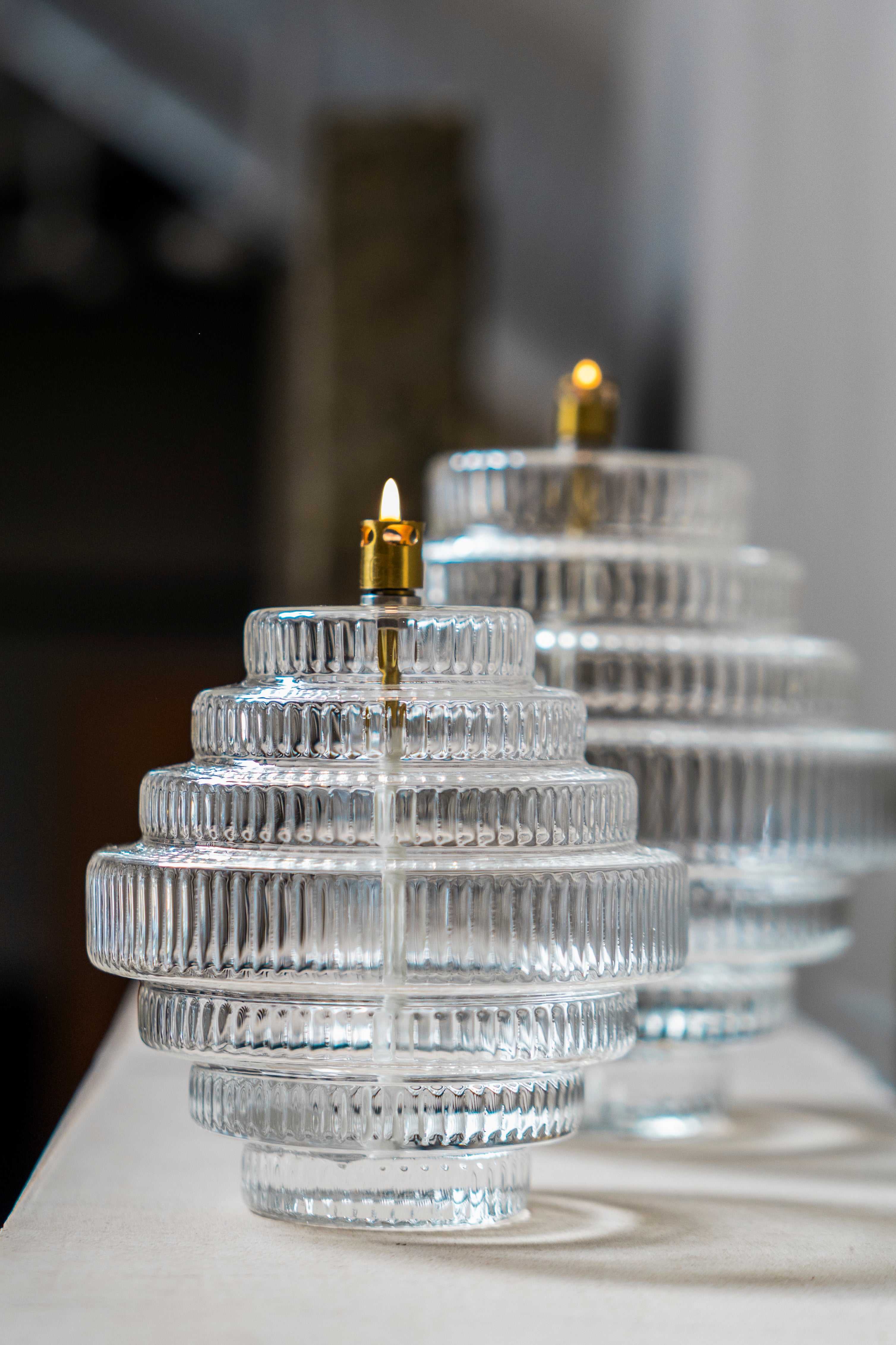 The ‘Twin Clear Brass’ oil lamps exude elegance and sophistication with their unique, layered design.