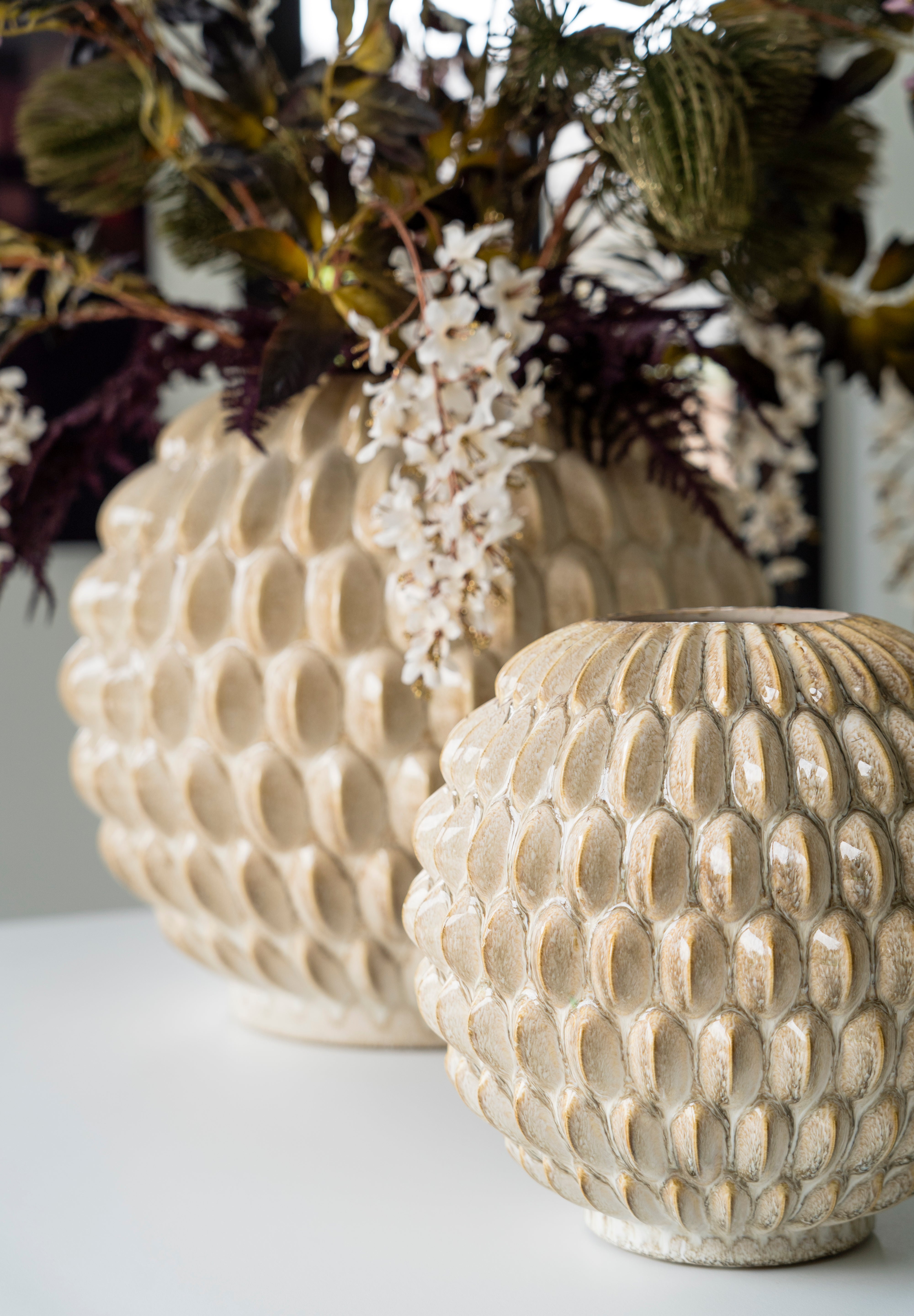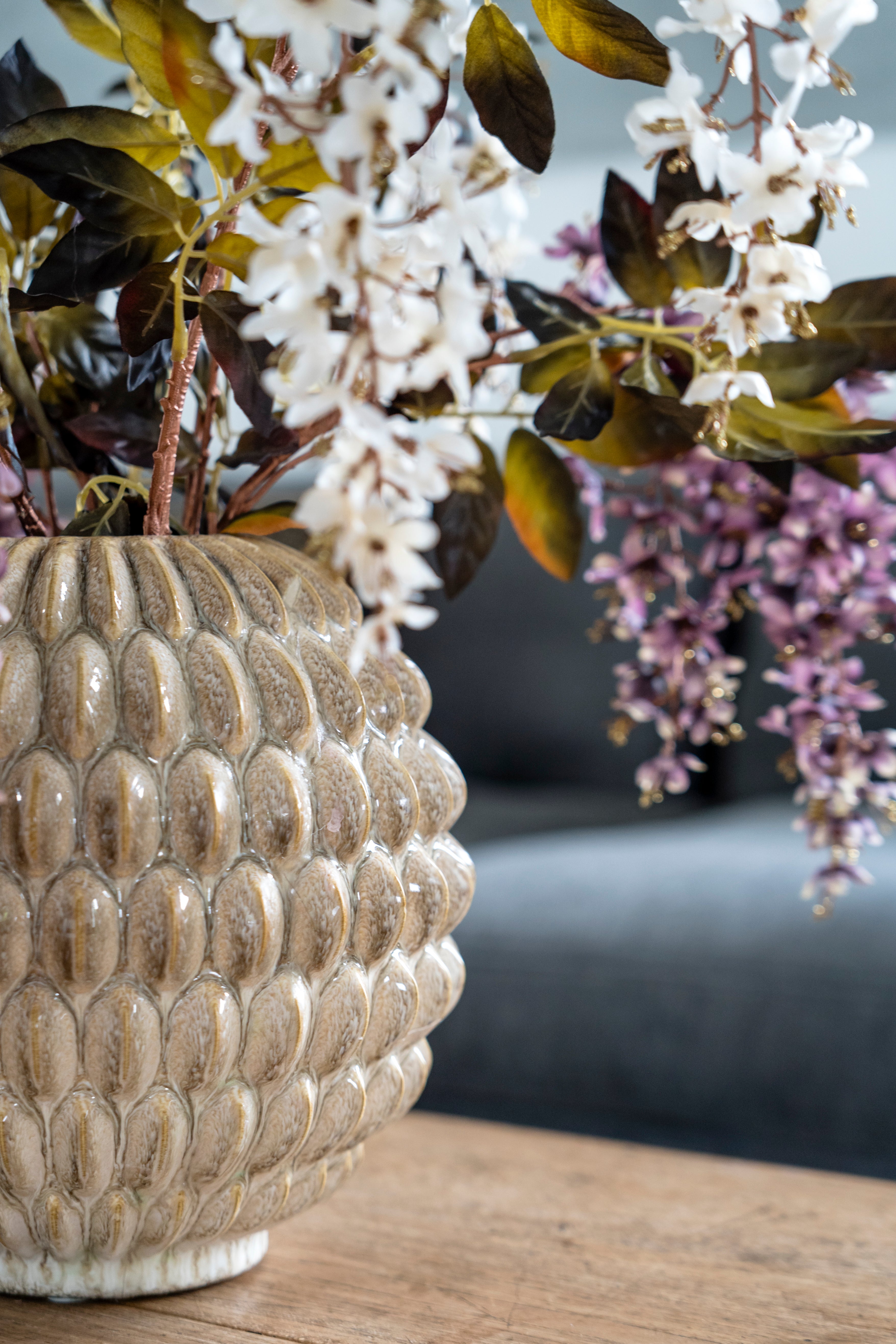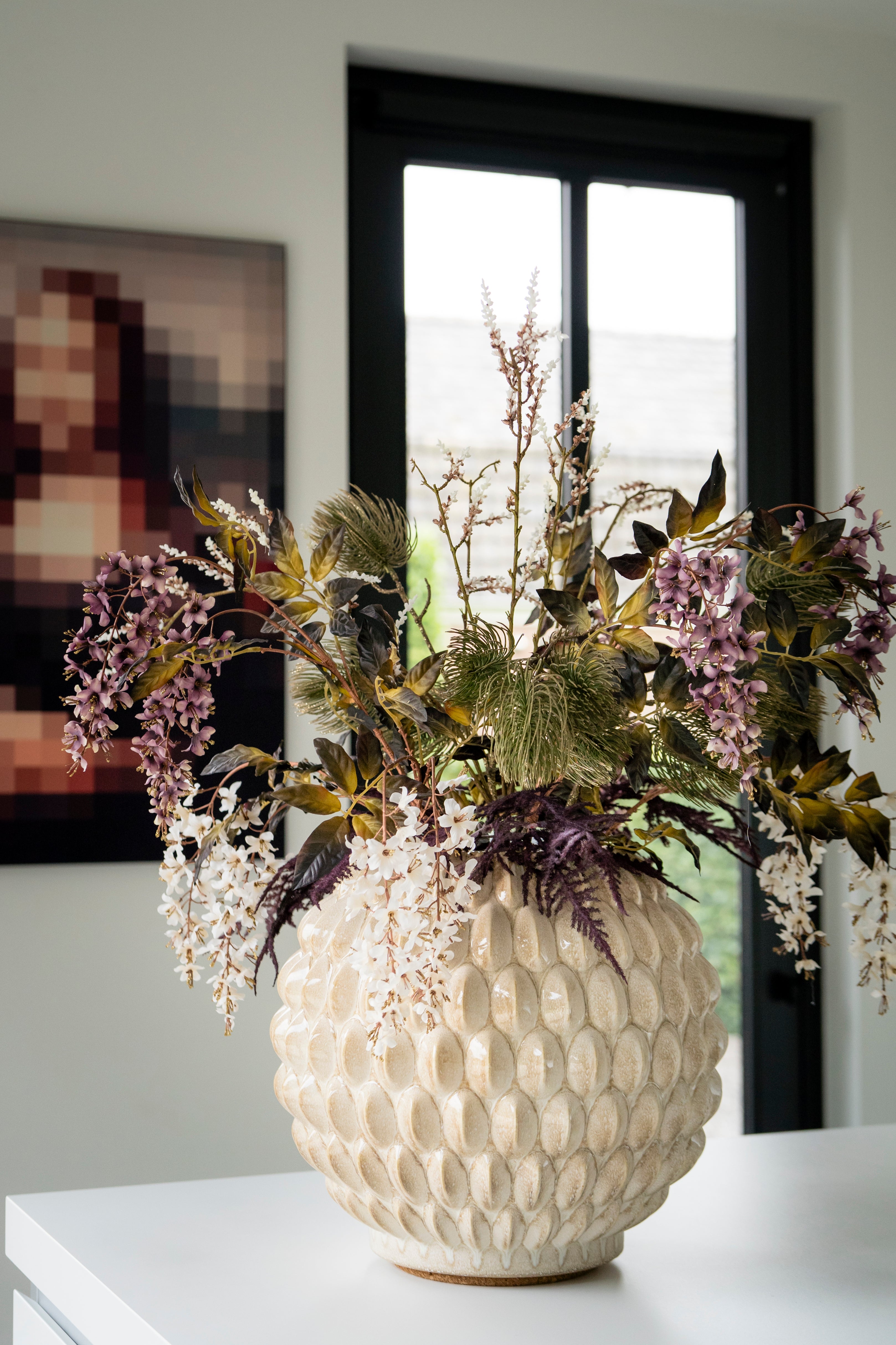 Voeg een vleugje moderne elegantie toe aan je interieur met de Bubble M vaas. Deze unieke vaas, met zijn zachte, beige kleur en speelse, bubbelsachtige vorm, trekt meteen de aandacht en geeft elke ruimte een subtiele maar stijlvolle uitstraling. Gemaakt van hoogwaardig keramiek en met afmetingen van 26 x 26 x 25 cm, is deze vaas ideaal voor het tentoonstellen van bloemen, takken of als een op zichzelf staande decoratie. Plaats hem op een tafel, plank of vensterbank en geniet van de verfijnde textuur en unieke vorm die je interieur een artistieke twist geeft.