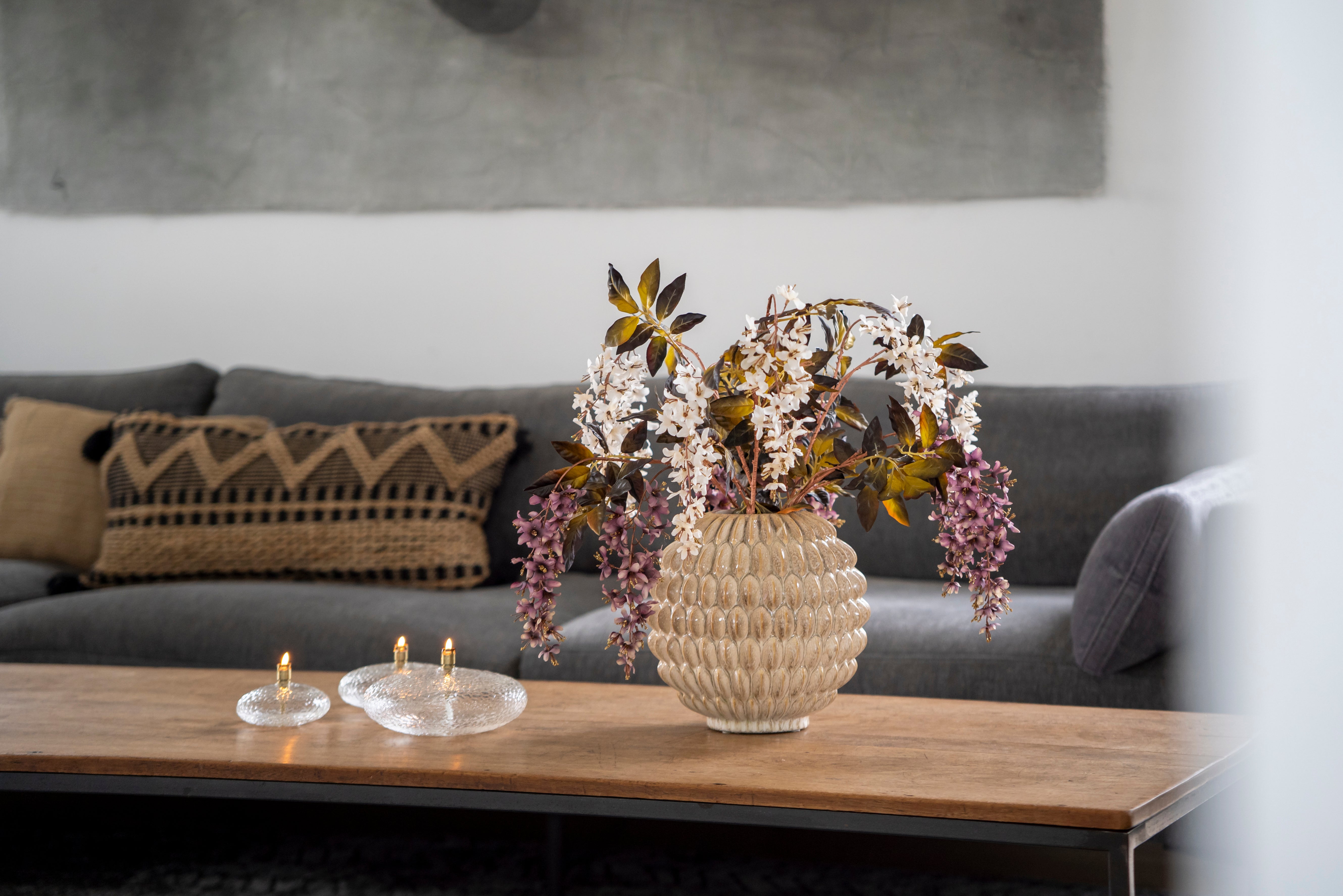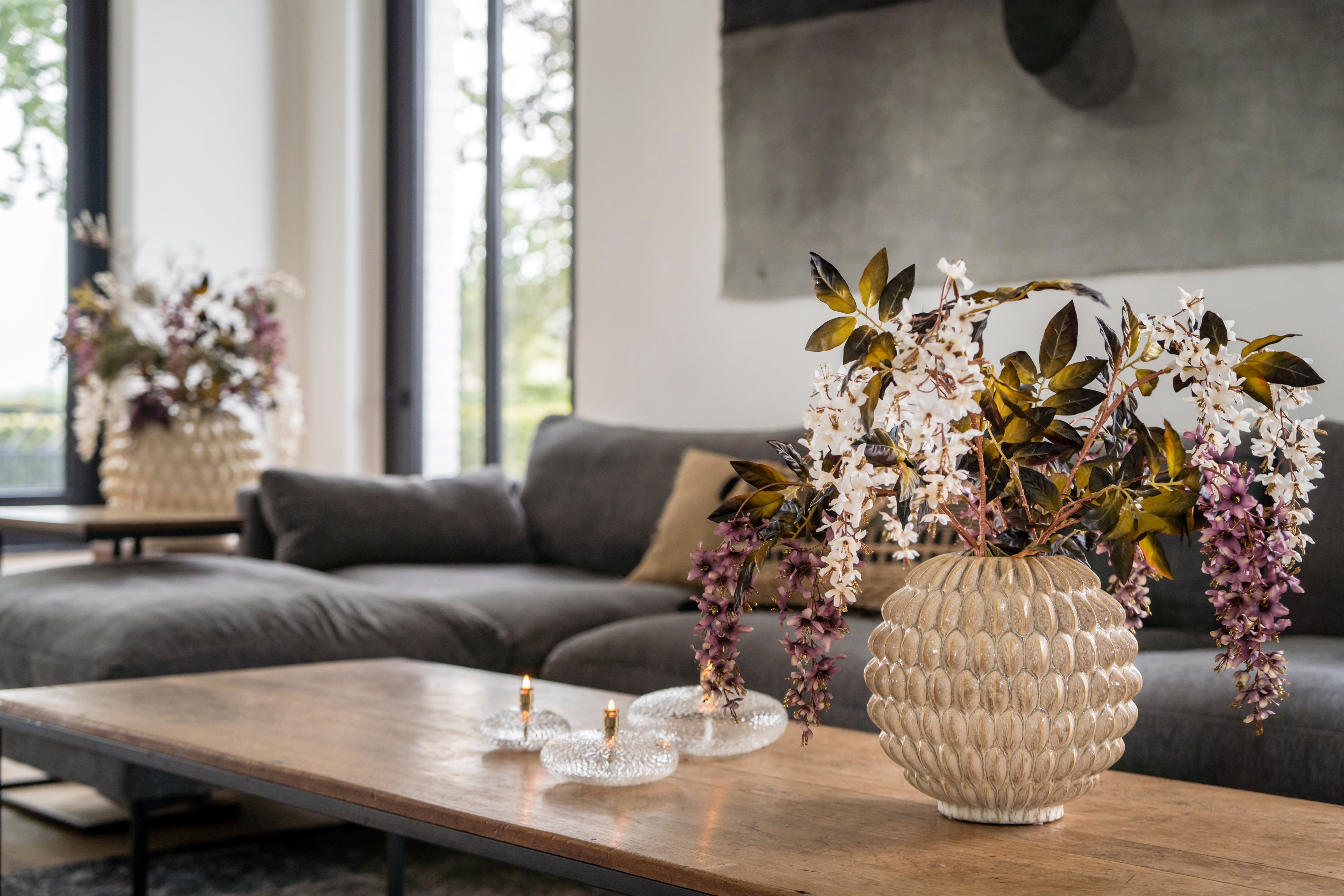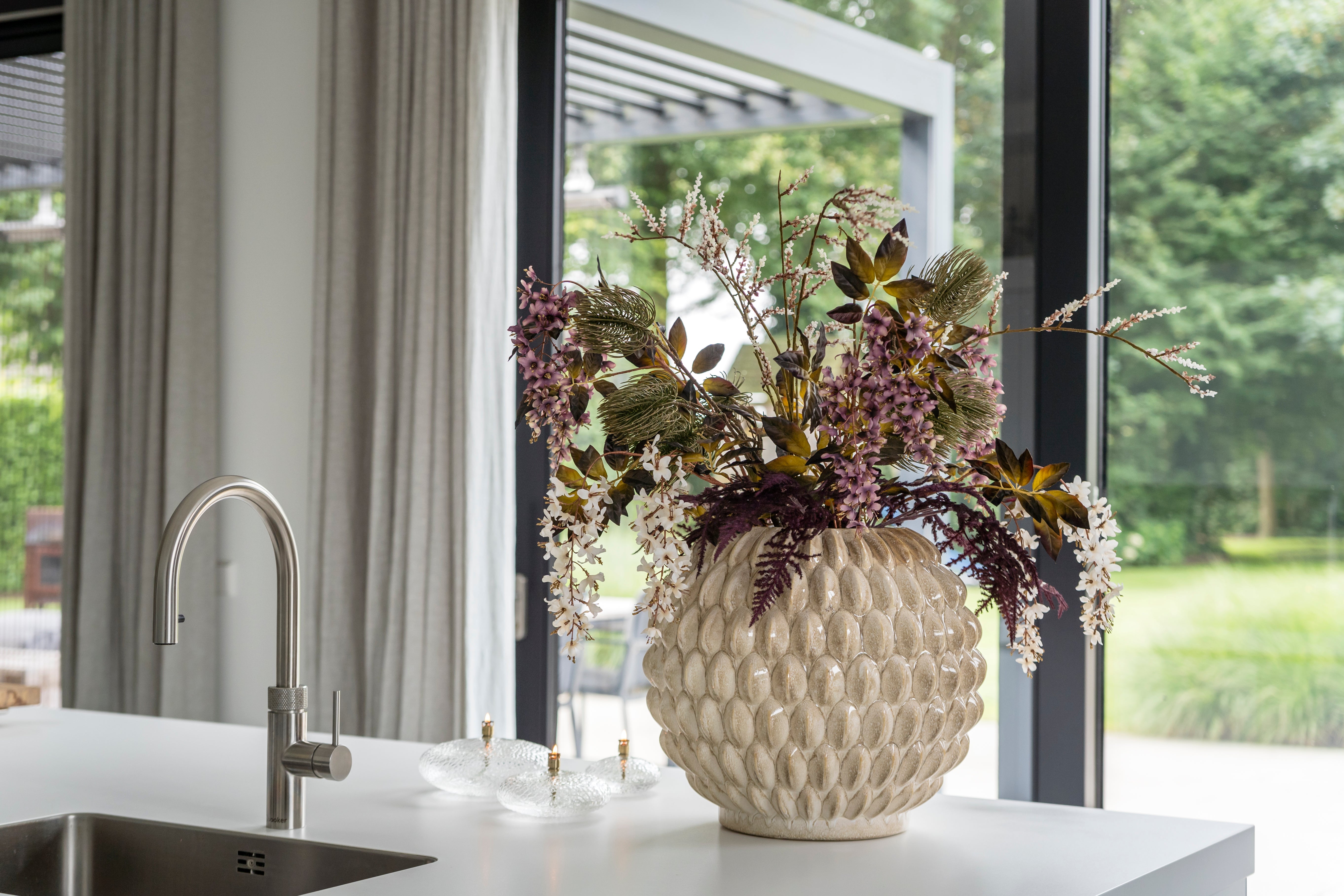 Voeg een vleugje moderne elegantie toe aan je interieur met de Bubble M vaas. Deze unieke vaas, met zijn zachte, beige kleur en speelse, bubbelsachtige vorm, trekt meteen de aandacht en geeft elke ruimte een subtiele maar stijlvolle uitstraling. Gemaakt van hoogwaardig keramiek en met afmetingen van 26 x 26 x 25 cm, is deze vaas ideaal voor het tentoonstellen van bloemen, takken of als een op zichzelf staande decoratie. Plaats hem op een tafel, plank of vensterbank en geniet van de verfijnde textuur en unieke vorm die je interieur een artistieke twist geeft.