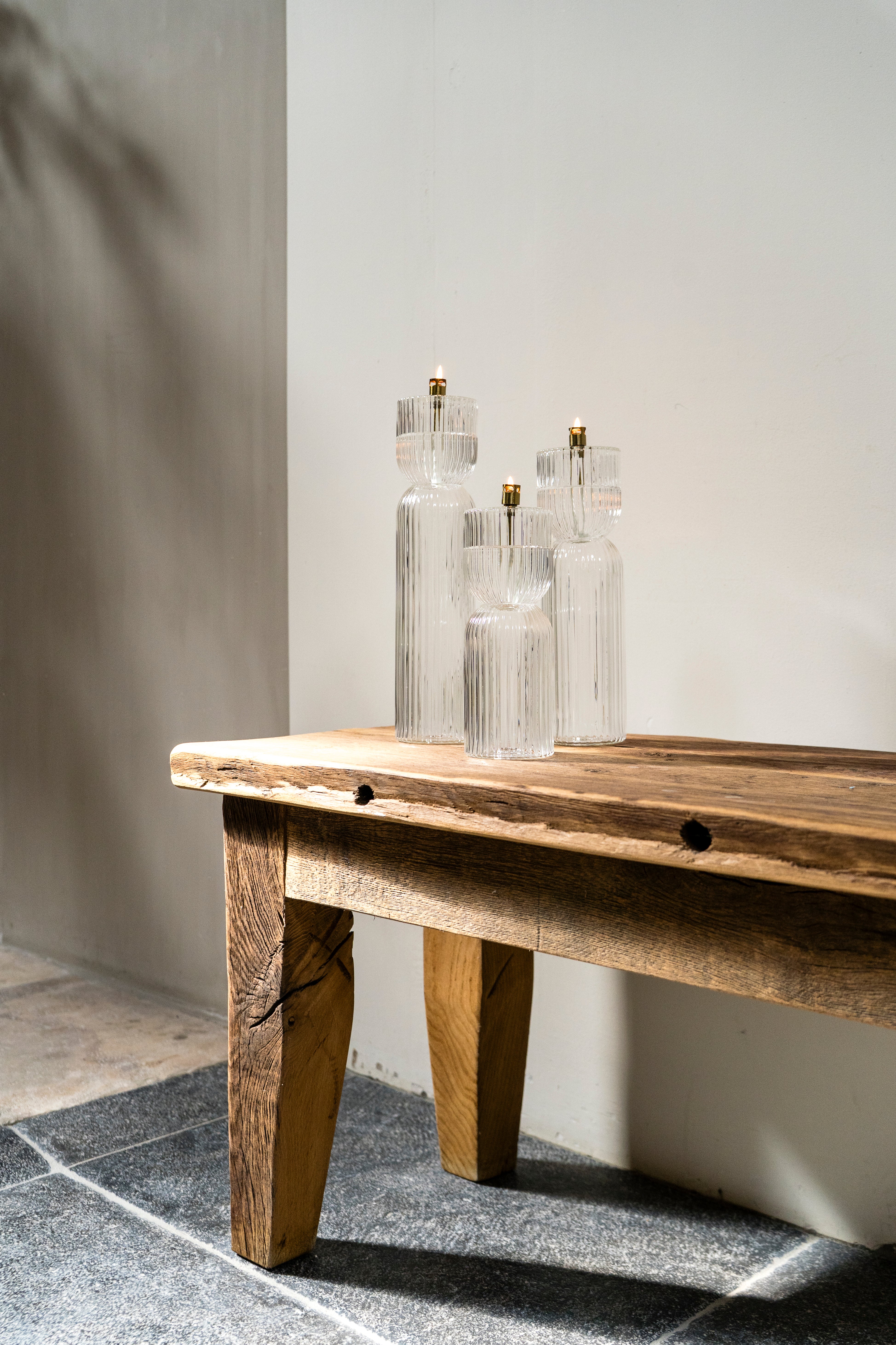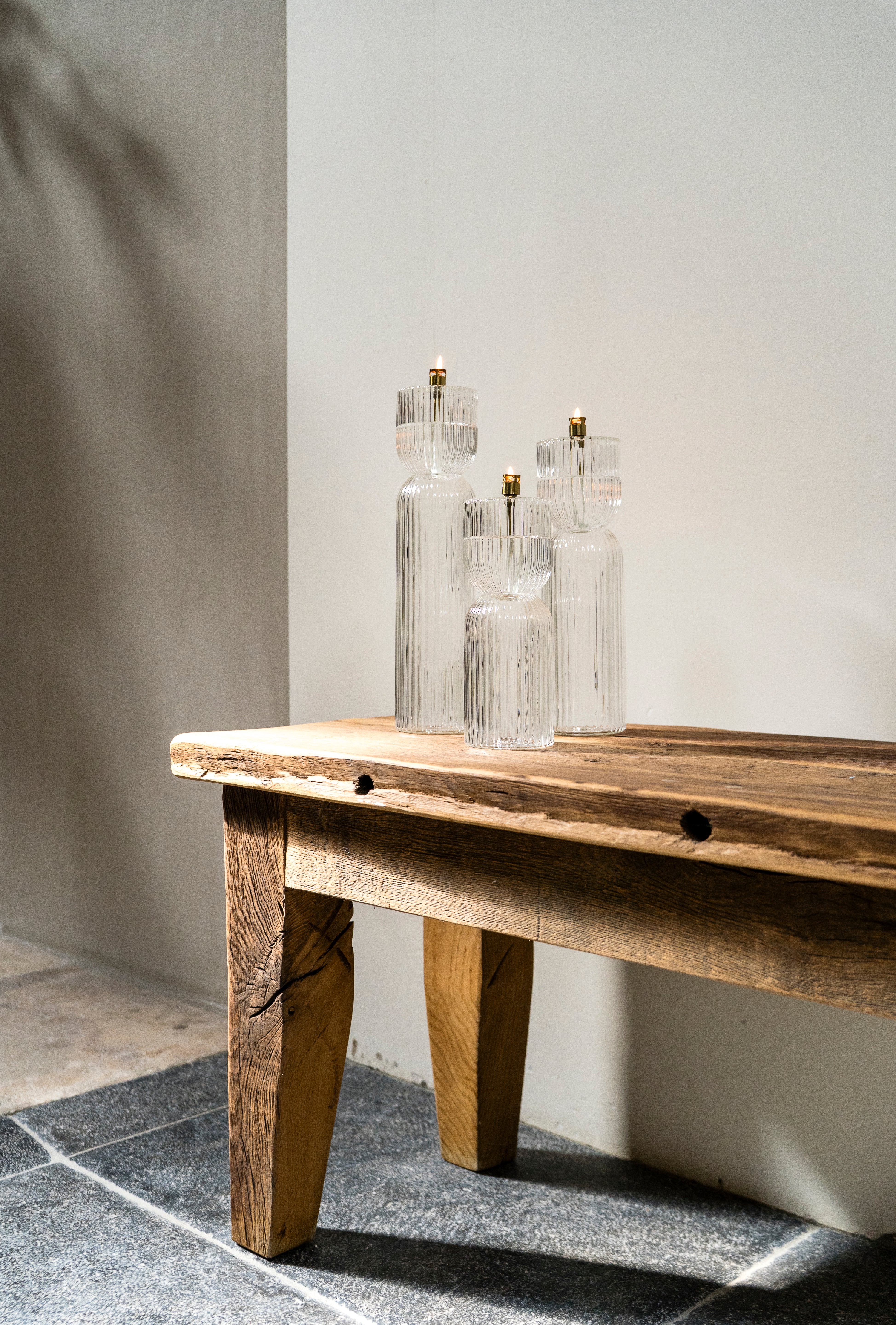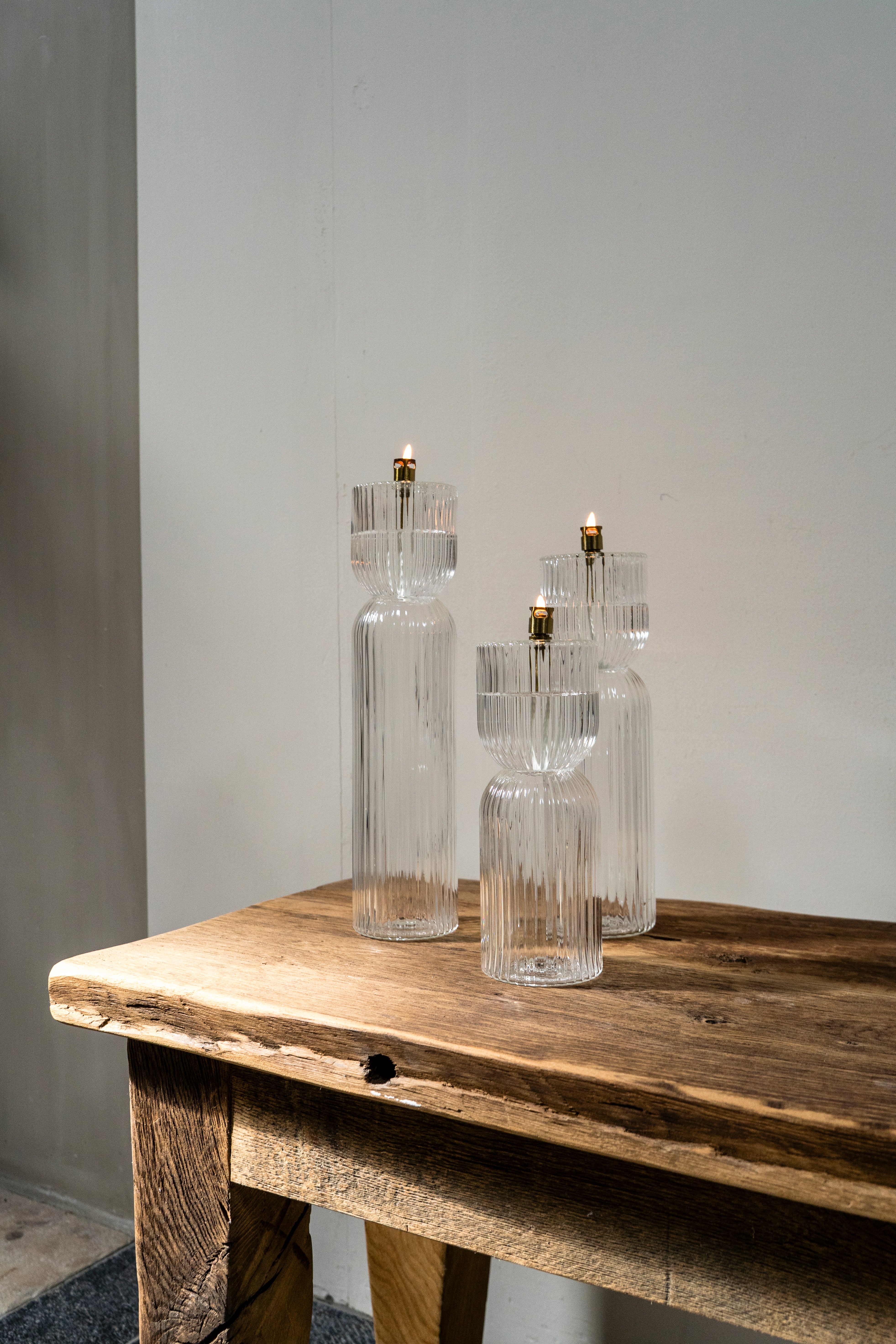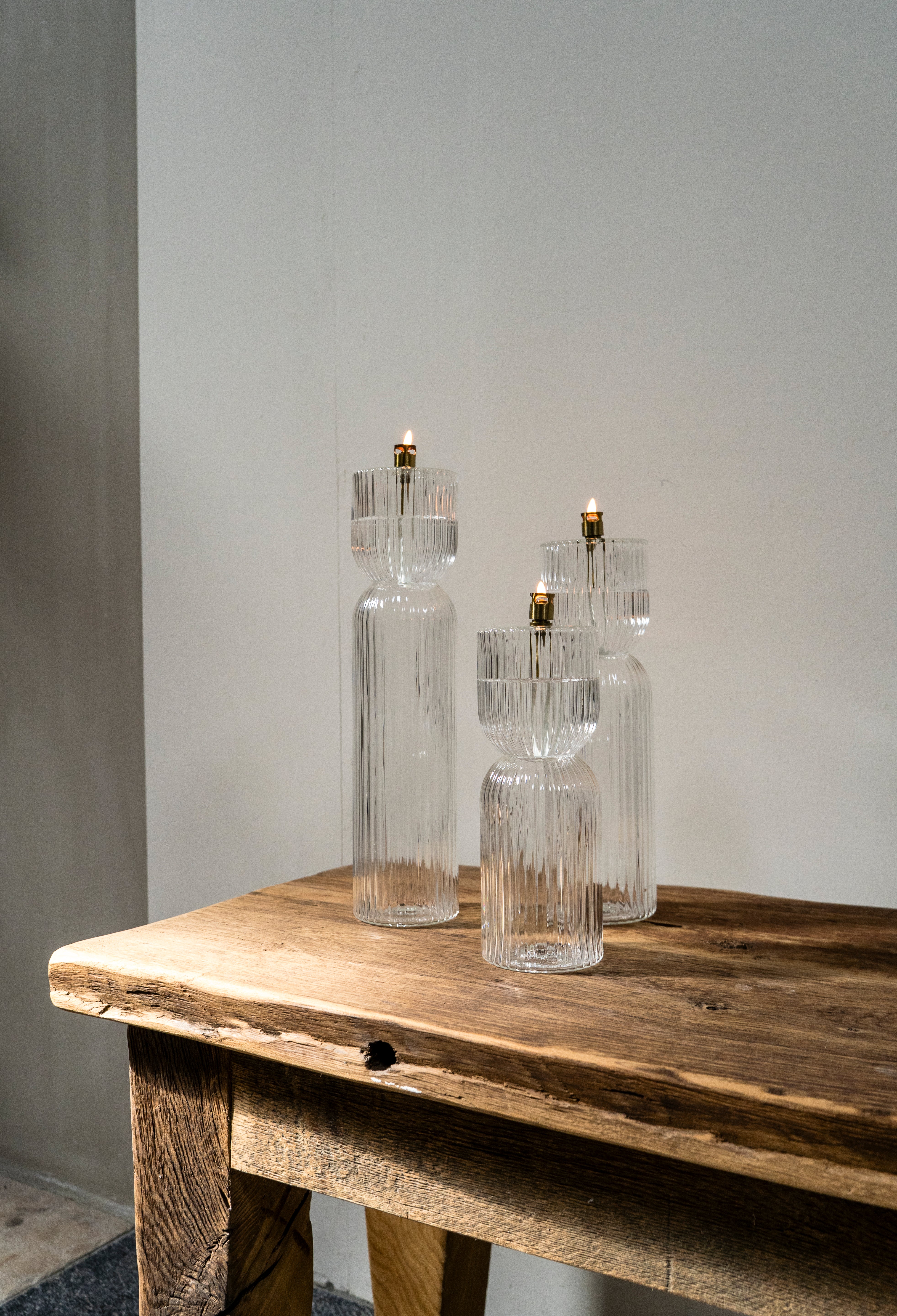 Met zijn slanke vorm en indrukwekkend formaat zijn deze olielampen bij uitstek geschikt als centraal element in een interieurpresentatie, etalage of opstelling op tafel. Het transparante glas laat de vlam prachtig tot zijn recht komen en verspreidt een warme gloed die sfeer en verfijning toevoegt aan elke ruimte.