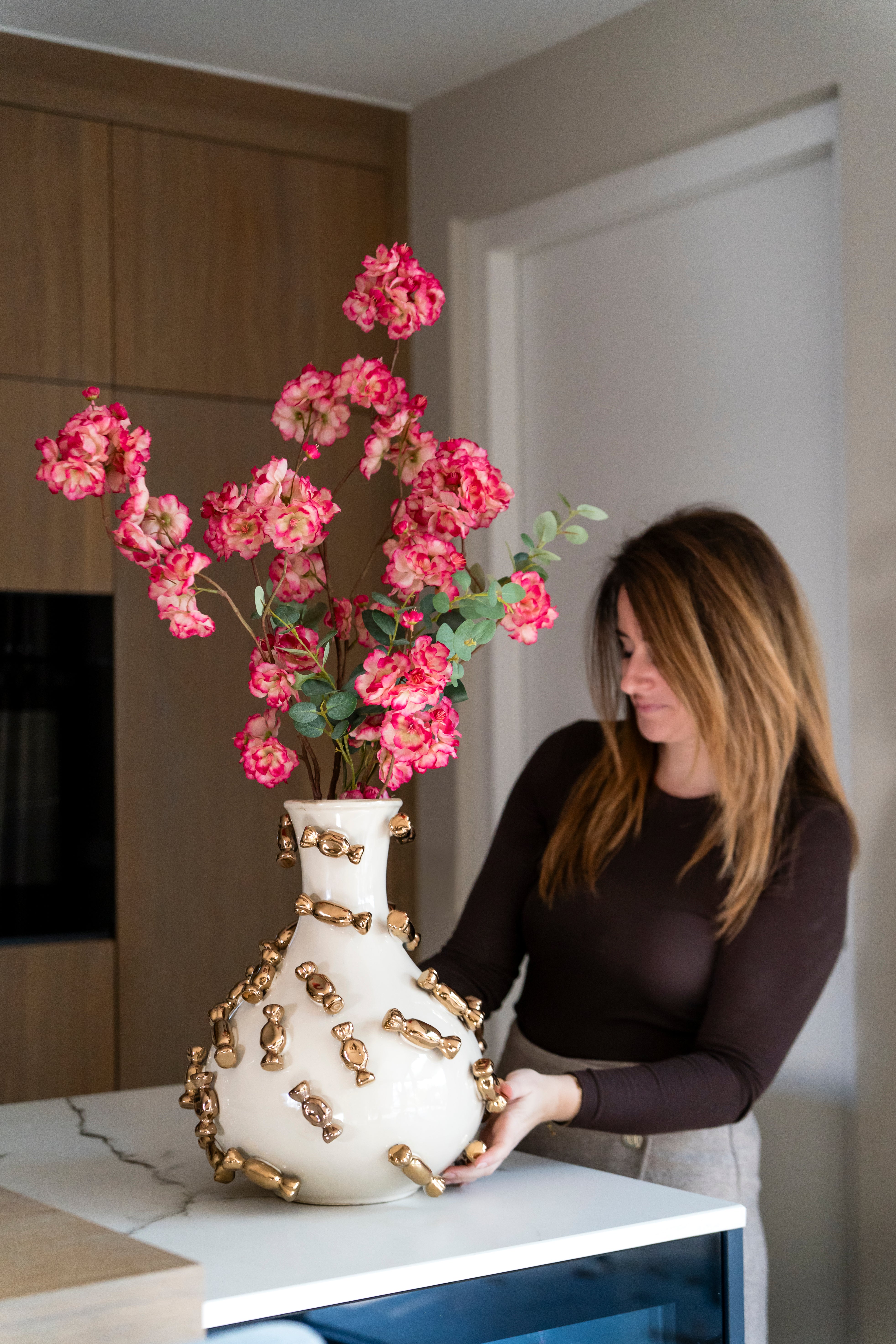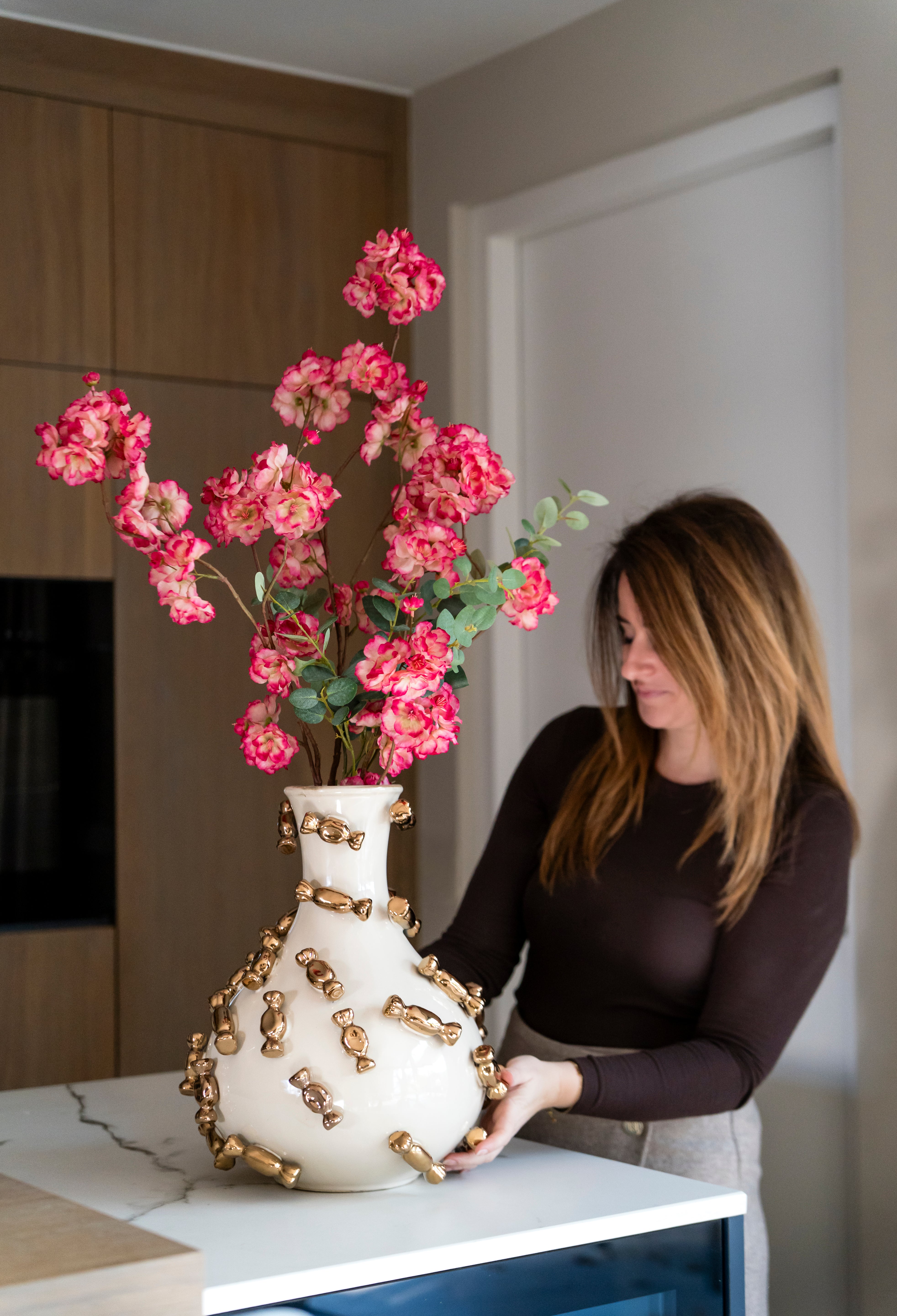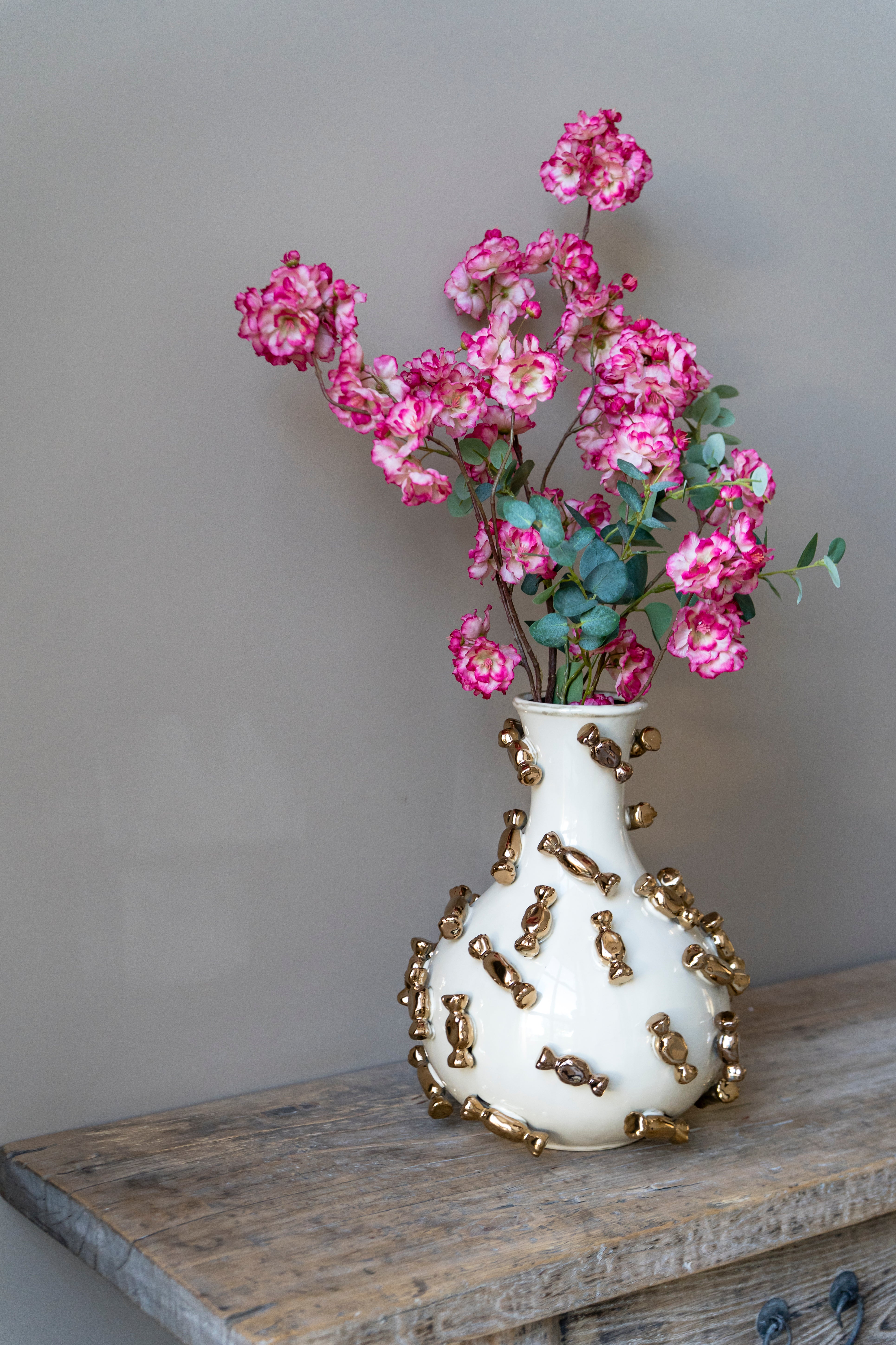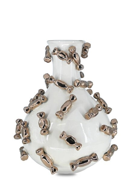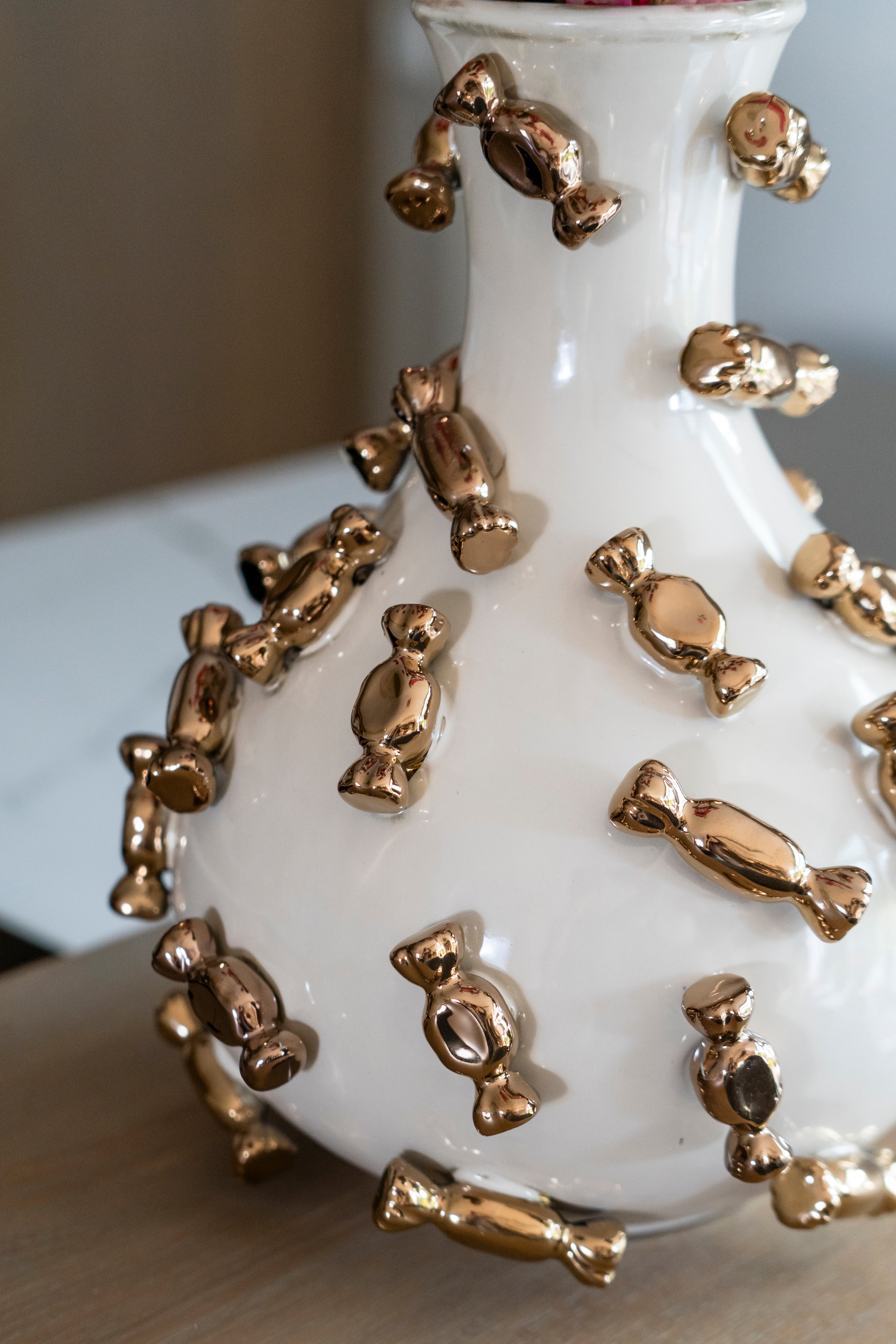 De Living Candy keramieke vaas is een echte blikvanger dankzij zijn organische vorm en opvallende 3D-details die over het gehele oppervlak zijn aangebracht. De combinatie van de zachte witte basis en de glanzende accenten geeft het ontwerp een luxe uitstraling met een eigentijdse twist.