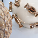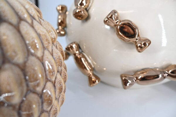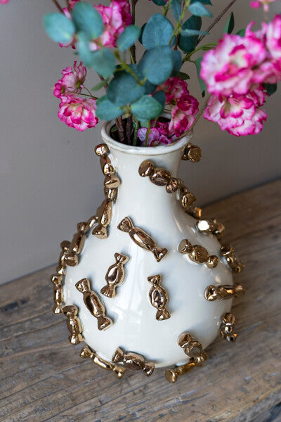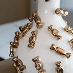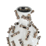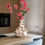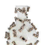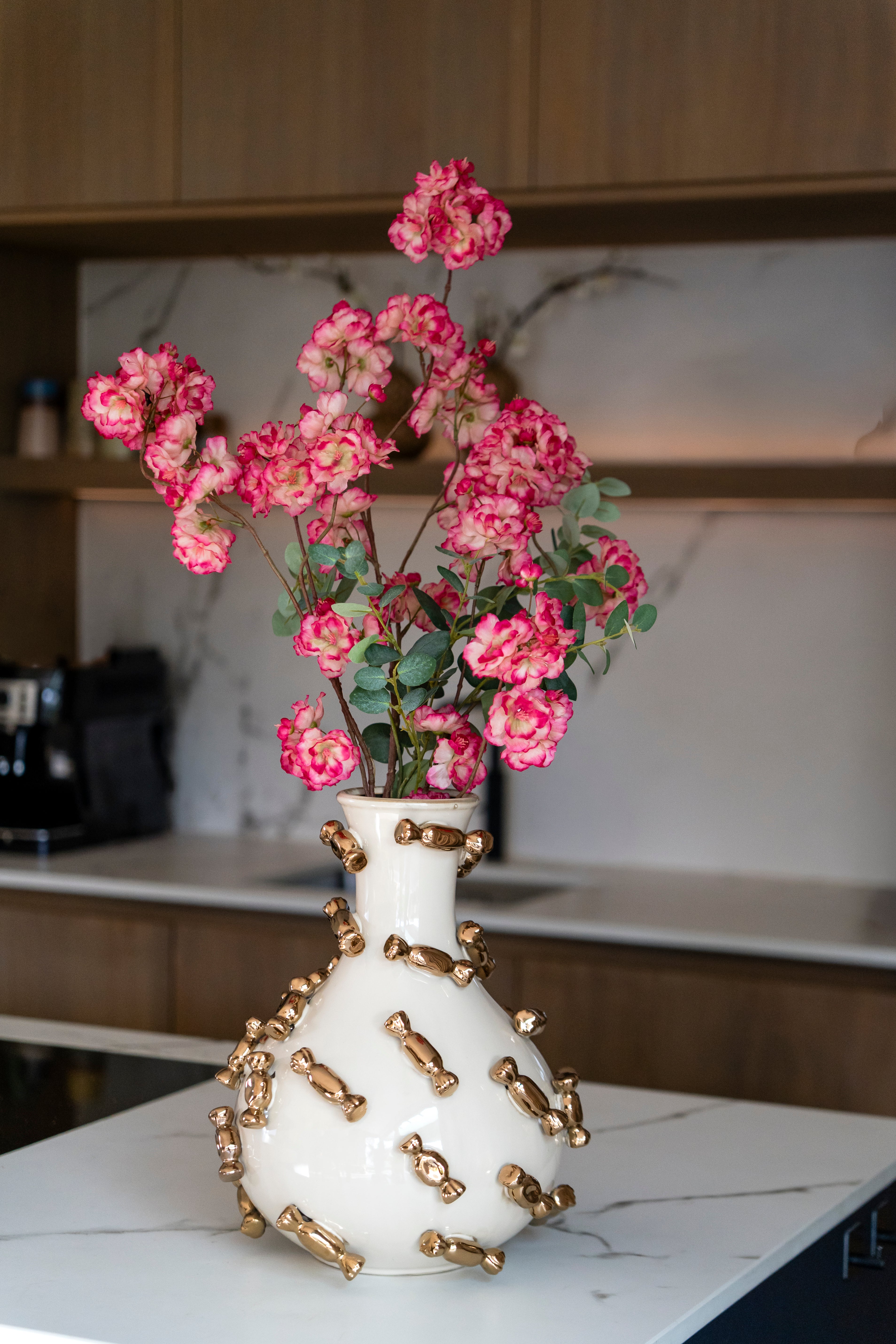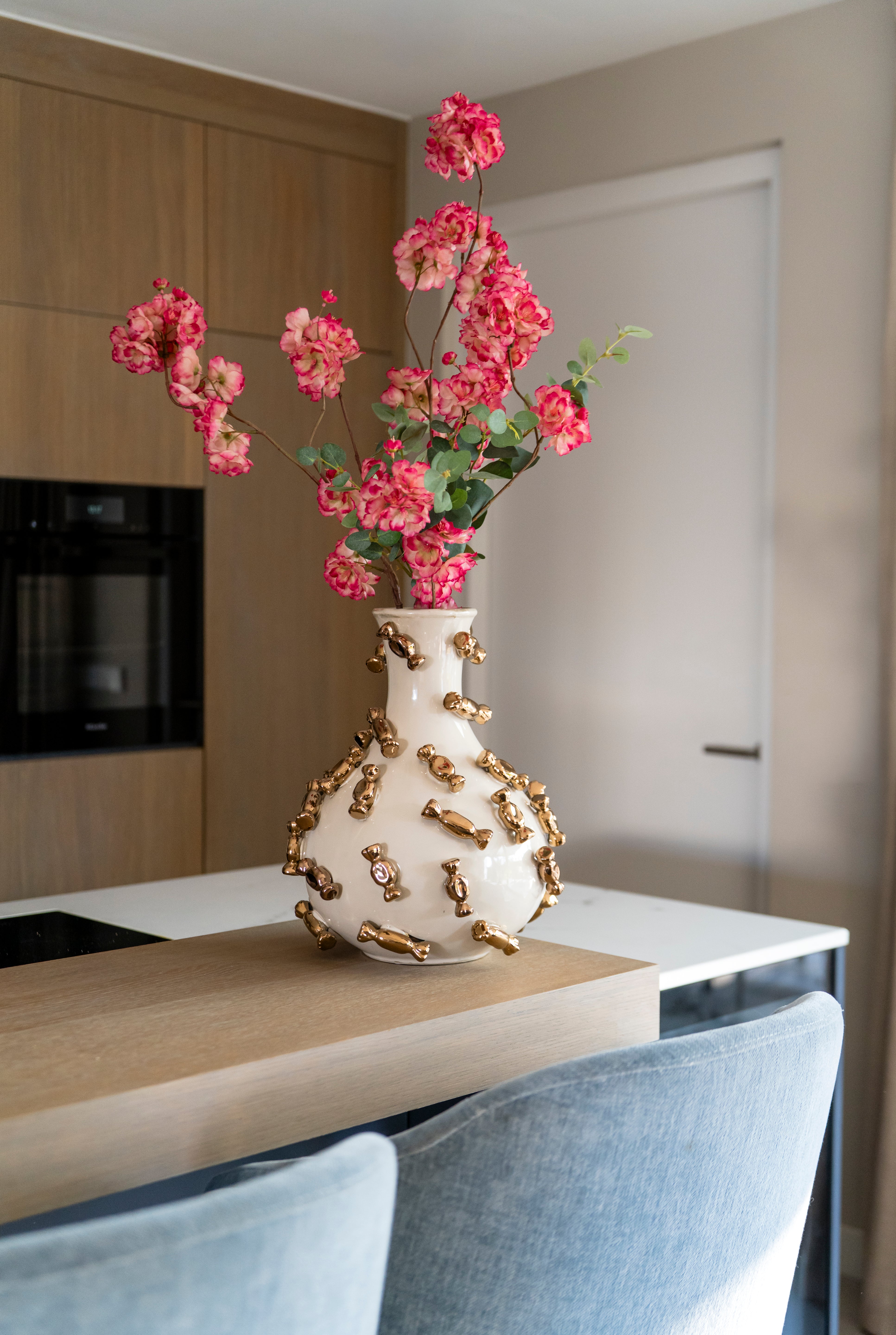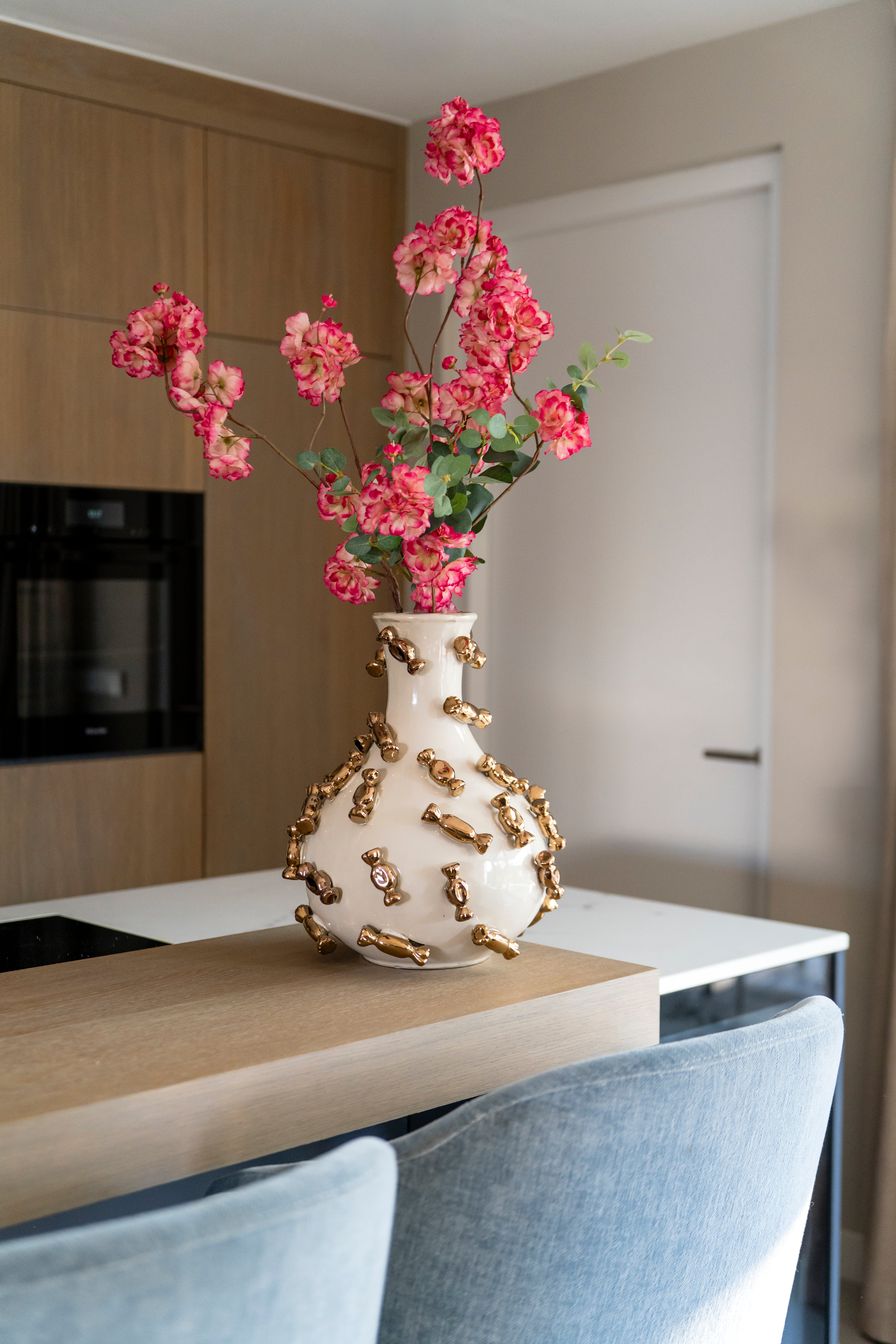 De Living Candy keramieke vaas is een echte blikvanger dankzij zijn organische vorm en opvallende 3D-details die over het gehele oppervlak zijn aangebracht. De combinatie van de zachte witte basis en de glanzende accenten geeft het ontwerp een luxe uitstraling met een eigentijdse twist.